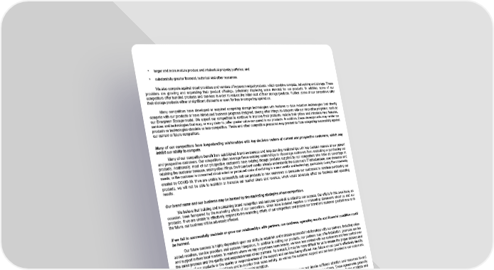 • larger and more mature product and intellectual property portfolios; and • substantially greater financial, technical and other resources. We also compete against cloud providers and vendors of hyperconverged products, which combine compute, networking and storage. These providers are growing and expanding their product offerings, potentially displacing some demand for our products. In addition, some of our competitors offer bundled products and services in order to reduce the initial cost of their storage products. Further, some of our competitors offer their storage products either at significant discounts or even for free in competing against us. Many competitors have developed or acquired competing storage technologies with features or data reduction technologies that directly compete with our products or have introduced business programs designed, among other things, to compete with our innovative programs, such as our Evergreen Storage model. We expect our competitors to continue to improve their products, reduce their prices and introduce new features, services and technologies that may, or may claim to, offer greater value compared to our products. In addition, these developments may render our products or technologies obsolete or less competitive. These and other competitive pressures may prevent us from competing successfully against our current or future competitors. Many of our competitors have long-standing relationships with key decision makers at current and prospective customers, which may inhibit our ability to compete. Many of our competitors benefit from established brand awareness and long-standing relationships with key decision makers at our current and prospective customers. Our competitors often leverage these existing relationships to discourage customers from evaluating or purchasing our products. Additionally, most of our prospective customers have existing storage products supplied by our competitors who have an advantage in retaining the customer because, among other things, the incumbent vendor already understands the customer’s IT infrastructure, user demands and needs, or the customer is concerned about actual or perceived costs of switching to a new vendor and technology, particularly during the uncertainty created by COVID-19. If we are unable to successfully sell our products to new customers or persuade our customers to continue purchasing our products, we will not be able to maintain or increase our market share and revenue, which would adversely affect our business and operating results. Our brand name and our business may be harmed by the marketing strategies of our competitors. We believe that building and maintaining brand recognition and customer goodwill is critical to our success. Our efforts in this area have, on occasion, been hampered by the marketing efforts of our competitors, which have included negative or misleading statements about us and our products. If we are unable to effectively respond to the marketing efforts of our competitors and protect our brand and customer goodwill now or in the future, our business will be adversely affected. If we fail to successfully maintain or grow our relationships with partners, our business, operating results and financial condition could be harmed. Our future success is highly dependent upon our ability to establish and maintain successful relationships with our partners, including value- added resellers, service providers and systems integrators. In addition to selling our products, our partners may offer installation, post-sale service and support in their local markets. In markets where we rely on partners more heavily, we have less contact with our customers and less control over the sales process and the quality and responsiveness of our partners. As a result, it may be more difficult for us to ensure the proper delivery and installation of our products or the quality or responsiveness of the support and services being offered. Any failure on our part to effectively identify, train and manage our channel partners and to monitor their sales activity, as well as the customer support and services provided to our customers, could harm our business, operating results and financial condition. Our partners may choose to discontinue offering our products and services or may not devote sufficient attention and resources toward selling our products and services. We typically enter into non-exclusive, written agreements with our channel partners. These agreements generally have a one-year, self-renewing term, have no minimum sales commitment and do not prohibit our channel partners from offering products and services that compete with ours. Additionally, our competitors provide incentives to our existing and potential channel partners to use, purchase or offer their products and services or to prevent or reduce sales of our products and services. The occurrence of any of these events could harm our business, operating results and financial condition. 14