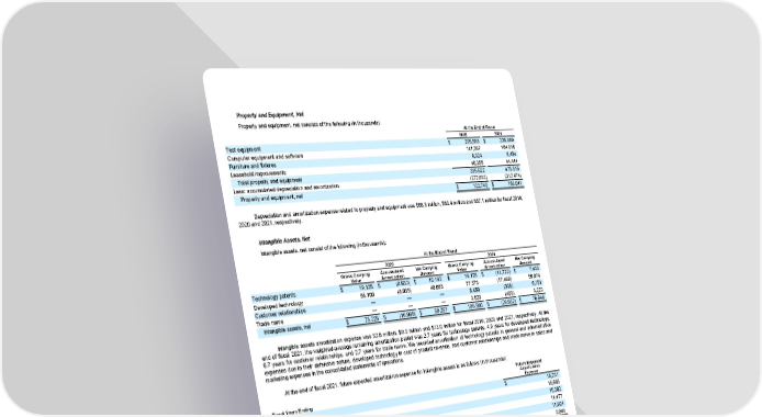 Property and Equipment, Net Property and equipment, net consists of the following (in thousands): At the End of Fiscal 2020 2021 Test equipment $ 205,555 $ 238,069 Computer equipment and software 141,387 184,518 Furniture and fixtures 8,324 8,484 Leasehold improvements 40,356 44,444 Total property and equipment 395,622 475,515 Less: accumulated depreciation and amortization (272,882) (312,474) Property and equipment, net $ 122,740 $ 163,041 Depreciation and amortization expense related to property and equipment was $68.3 million, $80.4 million and $57.1 million for fiscal 2019, 2020 and 2021, respectively. Intangible Assets, Net Intangible assets, net consist of the following (in thousands): At the End of Fiscal 2020 2021 Gross Carrying Accumulated Net Carrying Gross Carrying Accumulated Net Carrying Value Amortization Amount Value Amortization Amount Technology patents $ 19,125 $ (8,933) $ 10,192 $ 19,125 $ (11,722) $ 7,403 Developed technology 56,100 (8,035) 48,065 77,373 (17,499) 59,874 Customer relationships — — — 6,459 (308) 6,151 Trade name — — — 3,623 (403) 3,220 Intangible assets, net $ 75,225 $ (16,968) $ 58,257 $ 106,580 $ (29,932) $ 76,648 Intangible assets amortization expense was $2.6 million, $9.3 million and $13.0 million for fiscal 2019, 2020 and 2021, respectively. At the end of fiscal 2021, the weighted-average remaining amortization period was 2.7 years for technology patents, 4.9 years for developed technology, 6.7 years for customer relationships, and 2.7 years for trade name. We recorded amortization of technology patents in general and administrative expenses due to their defensive nature, developed technology in cost of product revenue, and customer relationships and trade name in sales and marketing expenses in the consolidated statements of operations. At the end of fiscal 2021, future expected amortization expense for intangible assets is as follows (in thousands): Future Expected Amortization Fiscal Years Ending Expense 2022 $ 16,231 2023 15,685 2024 15,282 2025 14,477 2026 11,924 Thereafter 3,049 Total $ 76,648 76