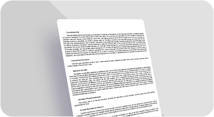 Concentration Risk Financial instruments that are exposed to concentration of credit risk consist primarily of cash and cash equivalents, marketable securities, and accounts receivable. At the end of fiscal 2020 and 2021, the majority of our cash and cash equivalents have been invested with three financial institutions and such deposits exceed federally insured limits. Management believes that the financial institutions that hold our investments are financially sound and, accordingly, are subject to minimal credit risk. We define a customer as an entity that purchases our products and services from one of our channel partners or from us directly. The majority of our revenue and accounts receivable are derived from the United States across a multitude of industries. We perform ongoing evaluations to determine customer credit. At the end of fiscal 2020 and 2021, no channel partner represented 10% or more of total accounts receivable, net. At the end of fiscal 2020 and 2021, we had one customer that represented 12% and 10% of accounts receivable, net. One channel partner represented 11% of revenue for fiscal 2019. No channel partner represented more than 10% of revenue for fiscal 2020 and 2021. No customer represented 10% or more of revenue for fiscal 2019, 2020 or 2021. We rely on a limited number of contract manufacturers and suppliers of components for our products. In instances where contract manufacturers and suppliers fail to perform their obligations, we may be unable to find alternative contract manufacturers and suppliers or satisfactorily deliver our products to our customers on time. Cash and Cash Equivalents Cash and cash equivalents consist of cash in banks and highly liquid investments, primarily money market accounts, purchased with an original maturity of three months or less. Marketable Securities We classify our marketable securities as available-for-sale (AFS) at the time of purchase and reevaluate such classification at each balance sheet date. We may sell these securities at any time for use in current operations even if they have not yet reached maturity. As a result, we classify our securities, including those with maturities beyond twelve months, as current assets in the consolidated balance sheets. We carry these securities at estimated fair value and record unrealized gains and losses in accumulated other comprehensive income (loss), which is reflected as a component of stockholders' equity. We evaluate our AFS debt securities with an unamortized cost basis in excess of estimated fair value to determine what amount of that difference, if any, is caused by expected credit losses. Credit-related impairment losses, not to exceed the amount that fair value is less than the amortized cost basis, are recognized through an allowance for credit losses with changes in the allowance for credit losses recognized as a charge to other income (expense), net, in the consolidated statements of operations. Any remaining impairment is included in accumulated other comprehensive income (loss) as a component of stockholders' equity. Realized gains and losses from the sale of marketable securities are determined based on the specific identification method. Realized gains and losses are reported in other income (expense), net in the consolidated statements of operations. Fair Value of Financial Instruments The carrying value of our financial instruments, including cash equivalents, accounts receivable, accounts payable and accrued liabilities, approximates fair value. Accounts Receivable and Allowance Accounts receivable are recorded at the invoiced amount, and stated at realizable value, net of an allowance for doubtful accounts. Credit is extended to customers based on an evaluation of their financial condition and other factors. We generally do not require collateral or other security to support accounts receivable. We perform ongoing credit evaluations of our customers and maintain an allowance for doubtful accounts. We assess the collectability of the accounts by taking into consideration the aging of our trade receivables, historical experience, and management judgment. We write off trade receivables against the allowance when management determines a balance is uncollectible and no longer actively pursues collection of the receivable. 64