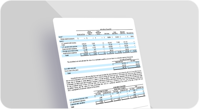At the End of Fiscal 2021 Gross Gross Unrealized Unrealized Cash Marketable Amortized Cost Gains Losses Fair Value Equivalents Securities Restricted Cash Level 1 Money market accounts $ — $ — $ — $ 49,984 $ 39,440 $ — $ 10,544 Level 2 U.S. government treasury notes 339,253 3,241 (1) 342,493 15,340 327,153 — U.S. government agencies 56,729 516 — 57,245 — 57,245 — Corporate debt securities 425,115 4,176 (33) 429,258 — 429,258 — Foreign government bonds 21,486 307 — 21,793 — 21,793 — Asset-backed securities 79,924 1,015 — 80,939 — 80,939 — Total $ 922,507 $ 9,255 $ (34) $ 981,712 $ 54,780 $ 916,388 $ 10,544 The amortized cost and estimated fair value of our marketable securities are shown below by contractual maturity (in thousands): At the End of Fiscal 2021 Amortized Cost Fair Value Due within one year $ 316,339 $ 318,019 Due in one to five years 590,828 598,369 $ 907,167 $ 916,388 Total Unrealized losses on our debt securities have not been recorded into income because we do not intend to sell nor is it more likely than not that we will be required to sell these investments prior to recovery of their amortized cost basis. The decline in fair value of our debt securities is largely due to changes in credit spreads as a result of market conditions. The credit ratings associated with our debt securities are mostly unchanged, are highly rated and the issuers continue to make timely principal and interest payments. As a result, there was no impairment charge for any unrealized losses in fiscal 2019 and 2020, and we had no credit losses recorded for fiscal 2021. The following table presents gross unrealized losses and fair values for those investments that were in a continuous unrealized loss position at the end of fiscal 2020 and 2021, aggregated by investment category (in thousands): At the End of Fiscal 2020 Less than 12 months Greater than 12 months Total Fair Value Unrealized Loss Fair Value Unrealized Loss Fair Value Unrealized Loss U.S. government treasury notes $ — $ — $ 1,000 $ — $ 1,000 $ — U.S. government agencies 4,998 (3) — — 4,998 (3) Corporate debt securities 9,691 (1) — — 9,691 (1) $ 14,689 $ (4) $ 1,000 $ — $ 15,689 $ (4) Total 72