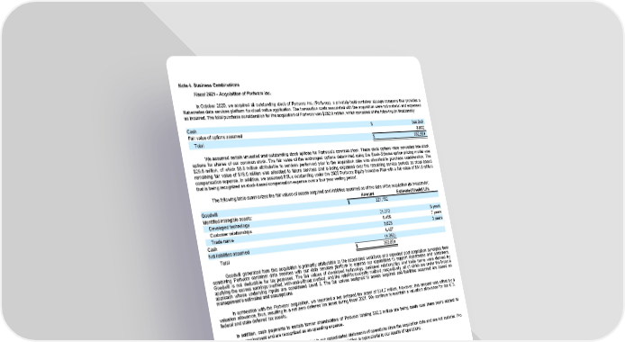 Note 4. Business Combinations Fiscal 2021 - Acquisition of Portworx Inc. In October 2020, we acquired all outstanding stock of Portworx Inc. (Portworx), a privately-held container storage company that provides a Kubernetes data services platform for cloud native application. The transaction costs associated with the acquisition were not material and expensed as incurred. The total purchase consideration for the acquisition of Portworx was $352.9 million, which consisted of the following (in thousands): Cash $ 344,049 Fair value of options assumed 8,802 $ 352,851 Total We assumed certain unvested and outstanding stock options for Portworx's common stock. These stock options were converted into stock options for shares of our common stock. The fair value of the exchanged options determined using the Black-Scholes option pricing model was $26.8 million, of which $8.8 million attributable to services performed prior to the acquisition date was allocated to purchase consideration. The remaining fair value of $18.0 million was allocated to future services and is being expensed over the remaining service periods as stock-based compensation expense. In addition, we assumed RSUs outstanding under the 2020 Portworx Equity Incentive Plan with a fair value of $31.8 million that is being recognized as stock-based compensation expense over a four year vesting period. The following table summarizes the fair values of assets acquired and liabilities assumed as of the date of the acquisition (in thousands): Amount Estimated Useful Life Goodwill $ 321,152 Identified intangible assets: Developed technology 21,273 5 years Customer relationships 6,459 7 years Trade name 3,623 3 years Cash 4,407 Net liabilities assumed (4,063) $ 352,851 Total Goodwill generated from this acquisition is primarily attributable to the assembled workforce and expected post-acquisition synergies from combining Portworx container data services with our data services platform to expand our capabilities to support Kubernetes and containers. Goodwill is not deductible for tax purposes. The fair values of developed technology, customer relationships and trade name were derived by applying the excess earnings method, with-and-without method, and the relief-from-royalty method, respectively, all of which are under the income approach whose underlying inputs are considered Level 3. The fair values assigned to assets acquired and liabilities assumed are based on management's estimates and assumptions. In connection with the Portworx acquisition, we recorded a net deferred tax asset of $14.7 million. However, this amount was offset by a valuation allowance, thus, resulting in a net zero deferred tax asset during fiscal 2021. We continue to maintain a valuation allowance for our U.S. federal and state deferred tax assets. In addition, cash payments to certain former shareholders of Portworx totaling $32.2 million are being made over three years subject to continuous employment and are recognized as an operating expense. The results of Portworx have been included in our consolidated statements of operations since the acquisition date and are not material. Pro forma results of operations have not been presented because the acquisition is not material to our results of operations. 74