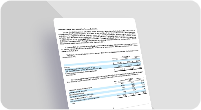 Note 13. Net Loss per Share Attributable to Common Stockholders Basic and diluted net loss per share attributable to common stockholders is presented in conformity with the two-class method required for participating securities. Basic net loss per share attributable to common stockholders is computed by dividing the net loss attributable to common stockholders by the weighted-average number of shares of common stock outstanding during the period, less shares subject to repurchase. Diluted net loss per share attributable to common stockholders is computed by giving effect to all potentially dilutive common stock equivalents, including our outstanding stock options, common stock related to unvested RSUs, unvested restricted stock, our Notes to the extent dilutive, and common stock issuable pursuant to the ESPP. These potentially dilutive common stock equivalents have been excluded from the calculation of diluted net loss per share attributable to common stockholders as their effect is anti-dilutive. In December 2018, all outstanding shares of Class B common stock converted to shares of Class A common stock pursuant to the terms of our amended and restated certificate of incorporation. The conversion did not impact our basic or diluted net loss per share attributable to common stockholders for fiscal 2019. The following table sets forth the computation of basic and diluted net loss per share attributable to common stockholders (in thousands, except per share data): Fiscal Year Ended 2019 2020 2021 $ (178,362) $ (200,987) $ (282,076) Net loss Weighted-average shares used in computing net loss 232,042 252,820 267,824 per share attributable to common stockholders, basic and diluted Net loss per share attributable to common stockholders, $ (0.77) $ (0.79) $ (1.05) basic and diluted The following weighted-average outstanding shares of common stock equivalents were excluded from the computation of diluted net loss per share attributable to common stockholders for the periods presented because including them would have been anti-dilutive (in thousands): Fiscal Year Ended 2019 2020 2021 Stock options to purchase common stock 39,928 31,315 23,180 Unvested restricted stock units 19,488 24,374 31,980 Unvested restricted stock 2,881 2,614 1,145 Shares related to convertible senior notes 17,867 21,884 21,884 Shares issuable pursuant to the ESPP 2,411 1,031 2,148 Early exercised stock options subject to repurchase 7 — — Total 82,582 81,218 80,337 87