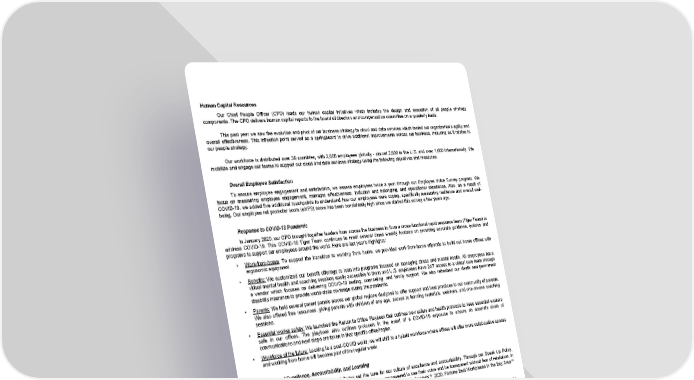 Human Capital Resources Our Chief People Officer (CPO) leads our human capital initiatives which includes the design and execution of all people strategy components. The CPO delivers human capital reports to the board of directors and compensation committee on a quarterly basis. This past year we saw the evolution and pivot of our business strategy to cloud and data services which tested our organization’s agility and overall effectiveness. This inflection point served as a springboard to drive additional improvements across our business, including as it relates to our people strategy. Our workforce is distributed over 39 countries, with 3,800 employees globally - almost 2,800 in the U.S. and over 1,000 internationally. We mobilize and engage our teams to support our cloud and data services strategy using the following objectives and measures. Overall Employee Satisfaction To ensure employee engagement and satisfaction, we assess employees twice a year through our Employee Voice Survey program. We focus on measuring employee engagement, manager effectiveness, inclusion and belonging, and operational excellence. Also, as a result of COVID-19, we added five additional touchpoints to understand how our employees were coping, specifically measuring resilience and overall well- being. Our employee net promoter score (eNPS) score has been consistently high since we started this survey a few years ago. Response to COVID-19 Pandemic In January 2020, our CPO brought together leaders from across the business to form a cross-functional rapid response team (Tiger Team) to address COVID-19. This COVID-19 Tiger Team continues to meet several times weekly focused on providing accurate guidance, policies and programs to support our employees around the world. Here are last year's highlights: • Work-from-home: To support the transition to working from home, we provided work-from-home stipends to build out home offices with ergonomic equipment. • Benefits: We customized our benefit offerings to lean into programs focused on managing stress and mental health. All employees have virtual mental health and coaching sessions easily accessible to them and U.S. employees have 24/7 access to a virtual care team through a vendor which focuses on delivering COVID-19 testing, counseling, and family support. We also refreshed our death and permanent disability insurance to provide world-class coverage during the pandemic. • Parents: We held several parent panels across our global regions designed to offer support and best practices to our community of parents. We also offered free resources, giving parents with children of any age, access to learning materials, webinars, and one-on-one coaching sessions. • Essential worker safety: We launched the Return to Office Playbook that outlines new safety and health protocols to keep essential workers safe in our offices. The playbook also outlines protocols in the event of a COVID-19 exposure to ensure an accurate chain of communications and next steps are taken in that specific office/region. • Workforce of the future: Looking to a post-COVID world, we will shift to a hybrid workforce where offices will offer more collaborative spaces and working from home will become part of the regular week. Culture of Excellence, Accountability, and Learning Our company goals and leadership attributes set the tone for our culture of excellence and accountability. Through our Speak Up Policy, Code of Conduct, and Culture of Compliance survey, employees are empowered to use their voice and be transparent without fear of retaliation. In recognition, we garnered several accolades this year: Fortune Best Workplaces in Technology™ 2020, Fortune Best Workplaces in the Bay Area™ 2020, and Fortune Best Workplaces for Parents. In the past year, the Pure Learning and Development team has redesigned all of their program offerings to an entirely virtual delivery model, while also creating new programs like Manager Essentials and Leading at Pure, which focus entirely on building our leaders of tomorrow. 10