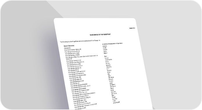 Exhibit 21.1 SUBSIDIARIES OF THE REGISTRANT The following is a list of significant and other subsidiaries of Pure Storage, Inc. Name of Subsidiary Jurisdiction of Incorporation or Organization Portworx Inc. Delaware Pure Crowns Sweden Holding AB Sweden Pure Storage Australia Pty Ltd Australia Pure Storage Austria, GmbH Austria Pure Storage Belgium BVBA Belgium Pure Storage do Brasil Solucoes e Servicos de Armazenamento de Dados Ltda Brazil Pure Storage Canada Limited Canada Pure Storage Czech Republic s.r.o. Czech Republic Pure Storage France SARL France Pure Storage Germany GmbH Germany Pure Storage Holdings, Inc. Delaware Pure Storage HK Ltd Hong Kong Pure Storage India Private Limited India Pure Storage International, Inc. Delaware Pure Storage International Limited Ireland Pure Storage Italy, SRL Italy Pure Storage Japan KK Japan Pure Storage Korea Co Ltd South Korea Pure Storage LLC Delaware Pure Storage Malaysia SDN BHD Malaysia Pure Storage Mexico S. de R.L. de C.V. Mexico Pure Storage Netherlands BV Netherlands Pure Storage New Zealand Limited New Zealand Pure Storage Poland sp. z o.o. Poland Pure Storage (RUS) Limited Liability Company Russia Pure Storage Singapore Pte Ltd Singapore Pure Storage South Africa (Pty) Ltd South Africa Pure Storage Spain, SLU Spain Pure Storage Sweden AB Sweden Pure Storage Switzerland GmbH Switzerland Pure Storage Bilgi Teknolojileri Limited Şirketi Turkey Pure Storage Ltd (UK) United Kingdom