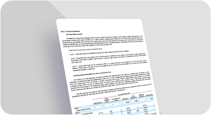 Note 3. Financial Instruments Fair Value Measurements We define fair value as the exchange price that would be received from sale of an asset or paid to transfer a liability in the principal or most advantageous market for the asset or liability in an orderly transaction between market participants on the measurement date. We measure our financial assets and liabilities at fair value at each reporting period using a fair value hierarchy which requires us to maximize the use of observable inputs and minimize the use of unobservable inputs when measuring fair value. A financial instrument’s classification within the fair value hierarchy is based upon the lowest level of input that is significant to the fair value measurement. Three levels of inputs may be used to measure fair value: • Level 1 - Observable inputs are unadjusted quoted prices in active markets for identical assets or liabilities; • Level 2 - Observable inputs are quoted prices for similar assets and liabilities in active markets or inputs other than quoted prices that are observable for the assets or liabilities, either directly or indirectly through market corroboration, for substantially the full term of the financial instruments; and • Level 3 - Unobservable inputs that are supported by little or no market activity and that are significant to the fair value of the assets or liabilities. These inputs are based on our own assumptions used to measure assets and liabilities at fair value and require significant management judgment or estimation. Cash Equivalents, Marketable Securities and Restricted Cash We measure our cash equivalents, marketable securities and restricted cash at fair value on a recurring basis. We classify our cash equivalents, marketable securities and restricted cash within Level 1 or Level 2 because they are valued using either quoted market prices or inputs other than quoted prices which are directly or indirectly observable in the market, including readily-available pricing sources for the identical underlying security which may not be actively traded. Our fixed income available-for-sale securities consist of high quality, investment grade securities from diverse issuers. The valuation techniques used to measure the fair value of our marketable securities were derived from non-binding market consensus prices that are corroborated by observable market data or quoted market prices for similar instruments. The following tables summarize our cash equivalents, marketable securities and restricted cash by significant investment categories and their classification within the fair value hierarchy at the end of fiscal 2020 and 2021 (in thousands): At the End of Fiscal 2020 Gross Unrealized Gross Unrealized Cash Marketable Amortized Cost Gains Losses Fair Value Equivalents Securities Restricted Cash Level 1 Money market accounts $ — $ — $ — $ 26,355 $ 11,068 $ — $ 15,287 Level 2 U.S. government treasury notes 323,751 2,146 — 325,897 — 325,897 — U.S. government agencies 53,930 317 (3) 54,244 — 54,244 — Corporate debt securities 452,318 3,954 (1) 456,271 3,001 453,270 — Foreign government bonds 14,994 147 — 15,141 — 15,141 — Asset-backed securities 87,267 699 — 87,966 — 87,966 — Total $ 932,260 $ 7,263 $ (4) $ 965,874 $ 14,069 $ 936,518 $ 15,287 71