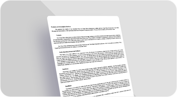 Products and Subscription Services We generate the majority of our revenues from our Cloud Data Infrastructure products and our Cloud Data Services and Cloud Data Management subscriptions which primarily include our Evergreen Storage subscription, Pure as-a-Service (PaaS), and Cloud Block Store. Products Our Cloud Data Infrastructure consists of deeply-integrated storage hardware and software solutions that enable cloud providers, enterprises, and governments to operate their global data infrastructure in the cloud. These solutions were built to be optimized for solid-state memory instead of the historical spinning hard drive media and achieve superior levels of performance and simplicity by deeply co-designing hardware, software, and cloud connectivity to create fully-integrated storage appliances. Our Cloud Data Infrastructure products include FlashArray and FlashBlade integrated appliances, which incorporate our proprietary Purity Operating Environment (Purity OE) software, as described below. Purity Operating Environment Software The heart of our data platform is our proprietary Purity OE software that implements enterprise-class storage services such as data reduction, encryption and data protection, as well as protocol services such as block, file and object. Variants of Purity OE have been optimized for both our FlashArray and FlashBlade platforms. Our Purity OE software delivers the most granular and complete data reduction, which powers industry-leading total efficiency across a wide range of use cases and data types. Our software implements strong data-at-rest encryption of all data and is designed to maintain performance through failures. It also enables our arrays to be easily upgraded without scheduled downtime, setting new expectations for storage resilience. With our DirectFlash architecture, recent versions of Purity OE have been optimized to speak directly to raw NAND Flash, enabling us to overcome the inefficiencies of prior commodity SSD architectures. FlashArray FlashArray is our solution for running block-oriented storage, typically deployed for database, application, and virtual machine workloads. FlashArray was the industry’s first all-flash array and has helped drive the industry-wide transition from disk to flash. FlashArray is available in two varieties, FlashArray//X (//X), optimized for the highest performance Tier1 workloads, leveraging 3D TLC flash and Storage Class Memory (SCM), and FlashArray//C (//C), for capacity Tier2 workloads, optimized for the adoption of lower-cost QLC flash memory. These products both run the Purity//FA software, which has been fully-optimized for the unique characteristics of flash memory and offers both consistency and interoperability of data between //X and //C. FlashArray has a history of driving innovation in the all-flash array market, including in recent years, pioneering adoption of latest technologies such as NVMe, NVMe-oF, and QLC flash. FlashBlade FlashBlade is our solution for unified fast file and object storage, typically deployed for “big data'' applications such as real-time analytics, AI, log analytics, and data protection and recovery workloads. FlashBlade was the industry’s first all-flash array optimized for big data workloads and enables all-flash hardware to scale to multi-Petabyte scale deployments. FlashBlade is a scale-out system running the Purity//FB software and includes integrated software-defined networking to deliver revolutionary performance and simplicity. FlashBlade’s large scale and multiple protocols allows it to be deployed as a Data Hub, enabling customers to consolidate big data analytics, application development, webscale cloud applications, and backup and recovery workloads, delivering all-flash performance in a cost-effective manner. FlashBlade is the industry's most advanced storage for unstructured data, consolidating complex data silos to optimize infrastructure and accelerate tomorrow's discoveries and insights. 6