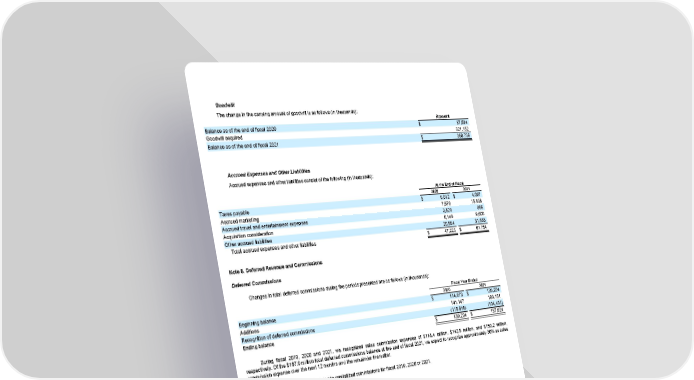 Goodwill The change in the carrying amount of goodwill is as follows (in thousands): Amount Balance as of the end of fiscal 2020 $ 37,584 Goodwill acquired 321,152 $ 358,736 Balance as of the end of fiscal 2021 Accrued Expenses and Other Liabilities Accrued expenses and other liabilities consist of the following (in thousands): At the End of Fiscal 2020 2021 Taxes payable $ 9,012 $ 4,097 Accrued marketing 7,679 15,638 Accrued travel and entertainment expenses 3,829 866 Acquisition consideration 6,149 9,600 Other accrued liabilities 20,554 31,553 Total accrued expenses and other liabilities $ 47,223 $ 61,754 Note 6. Deferred Revenue and Commissions Deferred Commissions Changes in total deferred commissions during the periods presented are as follows (in thousands): Fiscal Year Ended 2020 2021 Beginning balance $ 114,973 $ 139,204 Additions 141,147 183,151 Recognition of deferred commissions (116,916) (134,431) Ending balance $ 139,204 $ 187,924 During fiscal 2019, 2020 and 2021, we recognized sales commission expenses of $118.4 million, $142.5 million, and $150.2 million, respectively. Of the $187.9 million total deferred commissions balance at the end of fiscal 2021, we expect to recognize approximately 30% as sales commission expense over the next 12 months and the remainder thereafter. There was no impairment related to capitalized commissions for fiscal 2019, 2020 or 2021. Deferred Revenue Changes in total deferred revenue during the periods presented are as follows (in thousands): Fiscal Year Ended 2020 2021 Beginning balance $ 535,920 $ 697,288 Additions 569,816 703,800 Recognition of deferred revenue (408,448) (557,391) Ending balance $ 697,288 $ 843,697 During fiscal 2020 and 2021, we recognized approximately $267.0 million and $353.1 million, respectively, in revenue pertaining to deferred revenue as of the beginning of each period. 77