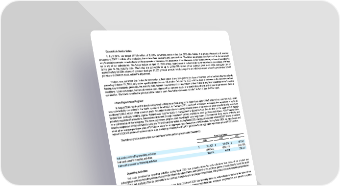 Convertible Senior Notes In April 2018, we issued $575.0 million of 0.125% convertible senior notes due 2023 (the Notes), in a private placement and received proceeds of $562.1 million, after deducting the underwriters' discounts and commissions. The Notes are unsecured obligations that do not contain any financial covenants or restrictions on the payments of dividends, the incurrence of indebtedness, or the issuance or repurchase of securities by us or any of our subsidiaries. The Notes mature on April 15, 2023 unless repurchased or redeemed by us or converted in accordance with their terms prior to the maturity date. The Notes are convertible for up to 21,884,155 shares of our common stock at an initial conversion rate of approximately 38.0594 shares of common stock per $1,000 principal amount, which is equal to an initial conversion price of approximately $26.27 per share of common stock, subject to adjustment. Holders may surrender their Notes for conversion at their option at any time prior to the close of business on the business day immediately preceding October 15, 2022, only under specific circumstances. On or after October 15, 2022 until the close of business on the second scheduled trading day immediately preceding the maturity date, holders may convert all or any portion of their Notes at any time regardless of the foregoing conditions. Upon conversion, holders will receive cash, shares of our common stock, or a combination of cash and shares of our common stock, at our election. We intend to settle the principal of the Notes in cash. See further discussion in Note 7 in Part II, Item 8 of this report. Share Repurchase Program In August 2019, our board of directors approved a stock repurchase program to repurchase up to $150.0 million of our common stock, which was substantially completed in the fourth quarter of fiscal 2021. In February 2021, our board of directors authorized the repurchase of up to an additional $200.0 million of our common stock. The authorization allows us to repurchase shares of our common stock opportunistically and will be funded from available working capital. Repurchases may be made at management’s discretion from time to time on the open market through privately negotiated transactions, transactions structured through investment banking institutions, block purchase techniques, 10b5-1 trading plans, or a combination of the foregoing. The share repurchase program does not obligate us to acquire any of our common stock, has no end date, and may be suspended or discontinued by us at any time without prior notice. During fiscal 2020, we repurchased and retired 867,657 shares of common stock at an average purchase price of $17.29 per share for an aggregate repurchase price of $15.0 million. During fiscal 2021, we repurchased and retired 9,526,556 shares of common stock at an average purchase price of $14.17 per share for an aggregate repurchase price of $135.0 million. The following table summarizes our cash flows for the periods presented (in thousands): Fiscal Year Ended 2019 2020 2021 Net cash provided by operating activities $ 164,423 $ 189,574 $ 187,641 Net cash used in investing activities (511,344) (324,711) (418,109) Net cash provided by financing activities 551,914 49,246 200,237 Operating Activities Net cash provided by operating activities during fiscal 2021 was primarily driven by cash collections from sales of our product and subscription services including certain invoices with extended payment terms and deferral of the employer portion of social security payroll tax under the CARES Act, partially offset by payments to our contract manufacturers, employee compensation, and general corporate operating expenditures. Net cash provided by operating activities during fiscal 2019 and 2020 was primarily driven by cash collections related to the sales of our product and subscription services, partially offset by payments to our contract manufacturers, employee compensation, and general corporate operating expenditures. 48