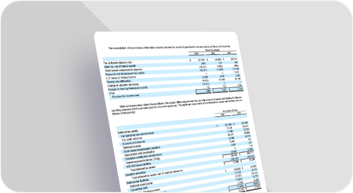 The reconciliation of income taxes at the federal statutory income tax rate to the provision for income taxes is as follows (in thousands): Fiscal Year Ended 2019 2020 2021 Tax at federal statutory rate $ (37,227) $ (40,880) $ (56,734) State tax, net of federal benefit (469) 210 349 Stock-based compensation expense (28,437) (6,683) (604) Research and development tax credits (10,371) (11,033) (14,138) U.S. taxes on foreign income — — 14,021 Foreign rate differential 12,299 2,935 2,282 Change in valuation allowance 85,533 61,050 63,146 Foreign on-shoring intellectual property (20,371) — — Other 132 722 3,594 Provision for income taxes $ 1,089 $ 6,321 $ 11,916 Deferred income taxes reflect the net effects of temporary differences between the carrying amounts of assets and liabilities for financial reporting purposes and the amounts used for income tax purposes. The significant components of our deferred tax assets and liabilities were as follows (in thousands): At the End of Fiscal 2020 2021 Deferred tax assets: Net operating loss carryforwards $ 232,155 $ 308,250 Tax credit carryover 76,209 104,247 Accruals and reserves 11,489 22,263 Deferred revenue 60,473 69,886 Stock-based compensation expense 31,906 28,310 Depreciation and amortization 18,893 120 Charitable contribution carryforwards 2,835 229 Interest expense limitation (163(j)) — 110 ASC 842 lease liabilities 25,197 33,302 Total deferred tax assets $ 459,157 $ 566,717 Valuation allowance (385,791) (484,437) Total deferred tax assets, net of valuation allowance $ 73,366 $ 82,280 Deferred tax liabilities: Deferred commissions $ (30,628) $ (41,526) Convertible debt (11,226) (8,147) ASC 842 right-of-use assets (23,502) (29,183) Acquired intangibles and goodwill (10,421) (8,727) Other (1,729) (2,230) Total deferred tax liabilities $ (77,506) $ (89,813) $ (4,140) $ (7,533) Net deferred tax liabilities 89