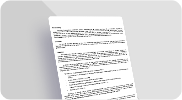 Manufacturing Our contract manufacturers manufacture, assemble, test and package our products in accordance with our specifications. We provide our contract manufacturers with a rolling forecast for anticipated orders, which our contract manufacturers use to build finished products. The product mix and volumes are adjusted based on anticipated demand and actual sales and shipments in prior periods. Our contract manufacturers are generally able to respond to changes in our product mix or volume without significant delay or increased costs. We work closely with our contract manufacturers to meet our product delivery requirements and to manage the manufacturing process and quality control. Seasonality We generally experience seasonality as sales of our products and subscription services are generally lower during the first quarter of our fiscal year and highest during the last quarter of our fiscal year. As a result, we expect that our business and results of operations will fluctuate from quarter to quarter. Competition We operate in the intensely competitive data storage market that is characterized by constant change and innovation. Changes in the application requirements, data center infrastructure trends and the broader technology landscape result in evolving customer requirements for capacity, performance scalability and enterprise features of storage systems. Our main competitors include legacy vendors, such as Dell EMC, Hitachi Vantara, HP Enterprise, IBM, and NetApp, each of which offer a broad range of systems targeting various use cases and end markets, and have the technical and financial resources to bring competitive products to market. In addition, we compete against cloud providers and vendors of hyperconverged products. Some large-scale cloud providers, known for developing storage systems internally, offer alternatives to our products for a variety of customer workloads. Our market attracts new startups and more highly specialized vendors, as well as other vendors that may continue to acquire or bundle products that compete with our offerings. All of our competitors utilize a broad range of competitive strategies. We believe the principal competitive factors in the storage market are as follows: • Product features and enhancements, including ease of use, performance, reliability, scalability, security, and complementary product offerings; • Product pricing and total cost of ownership; • Product interoperability with customer networks and backup software; • Global sales and distribution capability, including an ability to build and maintain senior customer relationships; • Ability to take advantage of improvements in industry standard components; and • Customer support and service. We believe we generally compete favorably with our competitors on these factors as a result of our hardware and software, product capabilities, ability to deliver the benefits of all-flash storage to a broad set of customers, management simplicity, ease of use and differentiated customer support. However, many of our competitors have substantially greater financial, technical and other resources, greater name recognition, larger sales and marketing budgets, broader distribution and larger and more mature intellectual property portfolios. Intellectual Property Our success depends in part upon our ability to protect our core technology and intellectual property. To establish and protect our proprietary rights, we rely on a combination of intellectual property rights, including patents, trademarks, copyrights, trade secret laws, license agreements, confidentiality procedures, employee disclosure and invention assignment agreements and other contractual rights. We have over 2,000 issued patents and patent applications in the United States and foreign countries. We also license technology from third parties when we believe it will facilitate our product offerings or business. 9