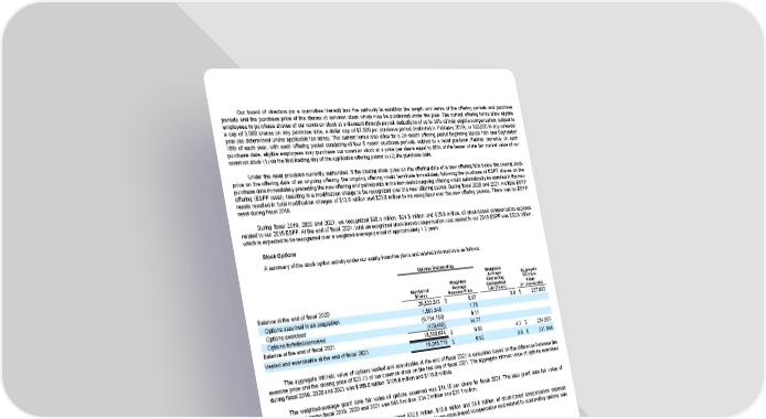 Our board of directors (or a committee thereof) has the authority to establish the length and terms of the offering periods and purchase periods and the purchase price of the shares of common stock which may be purchased under the plan. The current offering terms allow eligible employees to purchase shares of our common stock at a discount through payroll deductions of up to 30% of their eligible compensation, subject to a cap of 3,000 shares on any purchase date, a dollar cap of $7,500 per purchase period (instituted in February 2019), or $25,000 in any calendar year (as determined under applicable tax rules). The current terms also allow for a 24-month offering period beginning March 16th and September 16th of each year, with each offering period consisting of four 6 month purchase periods, subject to a reset provision. Further, currently, on each purchase date, eligible employees may purchase our common stock at a price per share equal to 85% of the lesser of the fair market value of our common stock (1) on the first trading day of the applicable offering period or (2) the purchase date. Under the reset provision currently authorized, if the closing stock price on the offering date of a new offering falls below the closing stock price on the offering date of an ongoing offering, the ongoing offering would terminate immediately following the purchase of ESPP shares on the purchase date immediately preceding the new offering and participants in the terminated ongoing offering would automatically be enrolled in the new offering (ESPP reset), resulting in a modification charge to be recognized over the new offering period. During fiscal 2020 and 2021, multiple ESPP resets resulted in total modification charges of $13.6 million and $23.8 million to be recognized over the new offering periods. There was no ESPP reset during fiscal 2019. During fiscal 2019, 2020 and 2021, we recognized $35.4 million, $24.5 million and $25.8 million, of stock-based compensation expense related to our 2015 ESPP. At the end of fiscal 2021, total unrecognized stock-based compensation cost related to our 2015 ESPP was $32.8 million, which is expected to be recognized over a weighted-average period of approximately 1.2 years. Stock Options A summary of the stock option activity under our equity incentive plans and related information is as follows: Options Outstanding Weighted- Average Aggregate Weighted- Remaining Intrinsic Number of Average Contractual Value Shares Exercise Price Life (Years) (in thousands) Balance at the end of fiscal 2020 26,822,243 $ 8.97 3.9 $ 237,803 Options assumed in an acquisition 1,891,349 1.75 Options exercised (9,734,153) 6.11 Options forfeited/canceled (420,465) 14.77 Balance at the end of fiscal 2021 18,558,974 $ 9.60 4.3 $ 251,503 Vested and exercisable at the end of fiscal 2021 16,016,719 $ 9.92 3.8 $ 211,566 The aggregate intrinsic value of options vested and exercisable at the end of fiscal 2021 is calculated based on the difference between the exercise price and the closing price of $23.13 of our common stock on the last day of fiscal 2021. The aggregate intrinsic value of options exercised during fiscal 2019, 2020 and 2021 was $165.0 million, $106.6 million and $118.8 million. The weighted-average grant date fair value of options assumed was $14.16 per share for fiscal 2021. The total grant date fair value of options vested during fiscal 2019, 2020 and 2021 was $45.6 million, $34.2 million and $20.1 million. During fiscal 2019, 2020 and 2021, we recognized $32.0 million, $15.8 million and $8.6 million, of stock-based compensation expense related to stock options. At the end of fiscal 2021, total unrecognized employee stock-based compensation cost related to outstanding options was $17.5 million, which is expected to be recognized over a weighted-average period of 2.2 years. 84