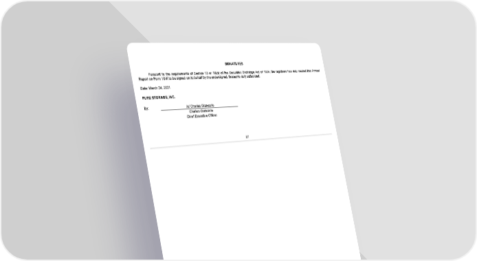 SIGNATURES Pursuant to the requirements of Section 13 or 15(d) of the Securities Exchange Act of 1934, the registrant has duly caused this Annual Report on Form 10-K to be signed on its behalf by the undersigned, thereunto duly authorized. Date: March 24, 2021 PURE STORAGE, INC. By: /s/ Charles Giancarlo Charles Giancarlo Chief Executive Officer 97