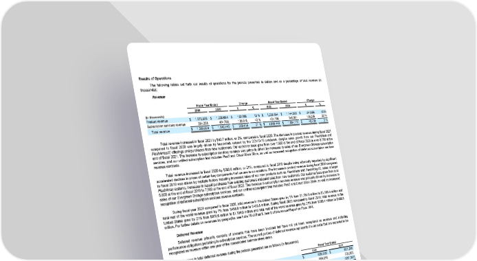 Results of Operations The following tables set forth our results of operations for the periods presented in dollars and as a percentage of total revenue (in thousands): Revenue Fiscal Year Ended Change Fiscal Year Ended Change 2019 2020 $ % 2020 2021 $ % (in thousands) Product revenue $ 1,075,586 $ 1,238,654 $ 163,068 15 % $ 1,238,654 $ 1,144,098 $ (94,556) (8)% Subscription services revenue 284,238 404,786 120,548 42 % 404,786 540,081 135,295 33 % $ 1,359,824 $ 1,643,440 $ 283,616 21 % $ 1,643,440 $ 1,684,179 $ 40,739 2 % Total revenue Total revenue increased in fiscal 2021 by $40.7 million, or 2%, compared to fiscal 2020. The decrease in product revenue during fiscal 2021 compared to fiscal 2020 was largely driven by headwinds caused by the COVID-19 pandemic, despite sales growth from our FlashBlade and FlashArray//C offerings and purchases from new customers. Our customer base grew from over 7,500 at the end of fiscal 2020 to over 8,700 at the end of fiscal 2021. The increase in subscription services revenue was primarily driven by increases in sales of our Evergreen Storage subscription services, and our unified subscription that includes PaaS and Cloud Block Store, as well as increased recognition of deferred subscription services revenue contracts. Total revenue increased in fiscal 2020 by $283.6 million, or 21%, compared to fiscal 2019 despite being adversely impacted by significant accelerated declines in prices of certain key components that we use in our solutions. The increase in product revenue during fiscal 2020 compared to fiscal 2019 was driven by multiple factors including increased sales of our new products such as FlashBlade and FlashArray//C, sales of larger FlashArray systems, increases in repeat purchases from existing customers and purchases from new customers. Our customer base grew from over 5,800 at the end of fiscal 2019 to 7,500 at the end of fiscal 2020. The increase in subscription services revenue was primarily driven by increases in sales of our Evergreen Storage subscription services, and our unified subscription that includes PaaS and Cloud Block Store, as well as increased recognition of deferred subscription services revenue contracts. During fiscal year 2021 compared to fiscal 2020, total revenue in the United States grew by 1% from $1,184.9 million to $1,195.4 million and total rest of the world revenue grew by 7% from $458.5 million to $488.8 million. During fiscal 2020 compared to fiscal 2019, total revenue in the United States grew by 21% from $979.5 million to $1,184.9 million and total rest of the world revenue grew by 21% from $380.4 million to $458.5 million. For further details on revenues by geography, see Note 16 of Part II, Item 8 of this Annual Report on Form 10-K. Deferred Revenue Deferred revenue primarily consists of amounts that have been invoiced but have not yet been recognized as revenue and including performance obligations pertaining to subscription services. The current portion of deferred revenue represents the amounts that are expected to be recognized as revenue within one year of the consolidated balance sheet dates. Changes in total deferred revenue during the periods presented are as follows (in thousands): Fiscal Year Ended 2020 2021 Beginning balance $ 535,920 $ 697,288 Additions 569,816 703,800 Recognition of deferred revenue (408,448) (557,391) Ending balance $ 697,288 $ 843,697 Revenue recognized during fiscal 2020 and 2021 from deferred revenue at the beginning of each respective period was $267.0 million and $353.1 million. 40