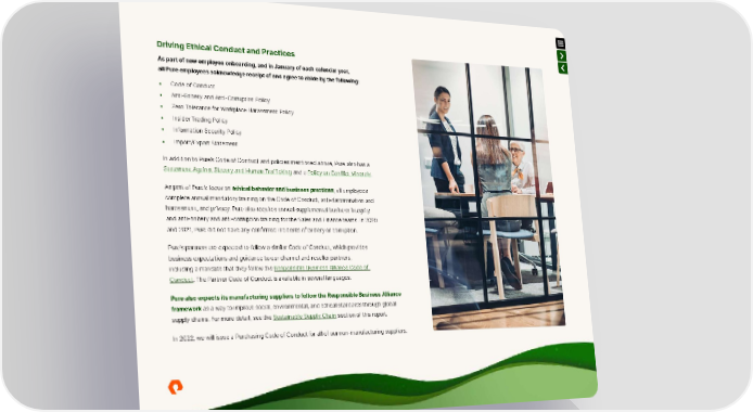 Driving Ethical Conduct and Practices As part of new employee onboarding, and in January of each calendar year, all Pure employees acknowledge receipt of and agree to abide by the following: • Code of Conduct • Anti-Bribery and Anti-Corruption Policy • Zero Tolerance for Workplace Harassment Policy • Insider Trading Policy • Information Security Policy • Import/Export Statement In addition to Pure’s Code of Conduct and policies mentioned above, Pure also has a Statement Against Slavery and Human Trafficking and a Policy on Conflict Minerals. As part of Pure’s focus on ethical behavior and business practices, all employees complete annual mandatory training on the Code of Conduct, anti-discrimination and harassment, and privacy. Pure also requires annual supplemental business integrity and anti-bribery and anti-corruption training for the Sales and Finance teams. In 2020 and 2021, Pure did not have any confirmed incidents of bribery or corruption. Pure’s partners are expected to follow a similar Code of Conduct, which provides business expectations and guidance to our channel and reseller partners, including a mandate that they follow the Responsible Business Alliance Code of Conduct. The Partner Code of Conduct is available in several languages. Pure also expects its manufacturing suppliers to follow the Responsible Business Alliance framework as a way to improve social, environmental, and ethical standards through global supply chains. For more detail, see the Sustainable Supply Chain section of this report. In 2022, we will issue a Purchasing Code of Conduct for all of our non-manufacturing suppliers.