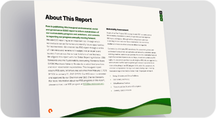 About This Report Pure is publishing this inaugural environmental, social Materiality Assessment and governance (ESG) report to inform stakeholders of As part of our Pure Purpose ESG strategy, in early 2021, we conducted our our sustainability progress and ambitions, and commits first materiality assessment to identify and prioritize our most important to reporting our progress annually moving forward. ESG topics and impacts. Although we have always been committed We see ESG reporting as an important tool through which to creating the best outcomes for our stakeholders, this assessment we evaluate our performance and identify future opportunities enables us to focus our efforts where we will be most impactful. for improvement. We created this ESG report through a series Conducted by a third-party ESG consultancy, the assessment gathered and of interviews and reviews with subject matter experts and synthesized feedback from our top leaders and various key stakeholder groups, leaders from across the various functions of our business. including investors, customers and partners. We used this stakeholder feedback We aligned this report with the Global Reporting Initiative (GRI) to prioritize our most important areas of impact. In addition to prioritizing ESG Standards and the Sustainability Accounting Standards Board topics, the assessment provided valuable insight on ESG risks and opportunities, (SASB) Hardware Industry Standards to adopt best practices which we used to refine our management practices and align on the future and meet stakeholder expectations. This inaugural report vision and roadmap of our ESG program. At the end of the assessment, we validated our top material ESG topics with our leadership team. These top covers ESG data, initiatives and activities from February 1, 2019 five material topics form the foundation of our ESG program and report. (FY20) to January 31, 2021 (FY21). Our ESG report is reviewed and approved by our Chairman and CEO, Charles Giancarlo. • Energy, Emissions and Climate Resilience For more information about our ESG programs or this report, • Data Security and Privacy please contact our ESG program at [email protected]. • Ethical Business Practices • Talent Acquisition, Retention & Development • Diversity, Equity & Inclusion