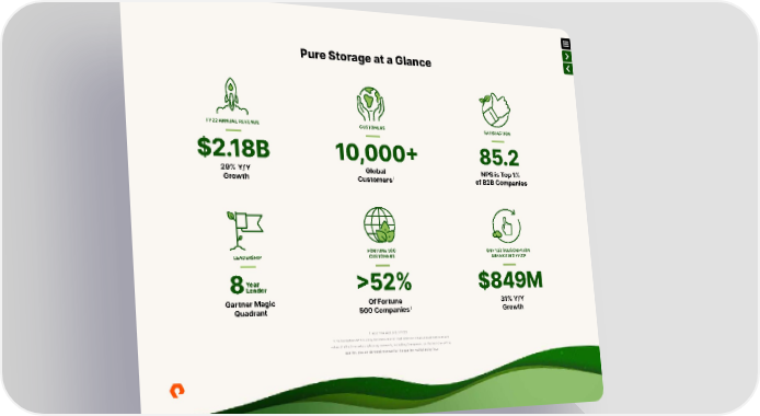 Pure Storage at a Glance FY22 ANNUAL REVENUE CUSTOMERS SATISFACTION $2.18B 10,000+ 85.2 29% Y/Y Global NPS is Top 1% Growth Customers1 of B2B Companies FORTUNE 500 Q4 FY22 SUBSCRIPTION 2 LEADERSHIP CUSTOMERS ARR EXITING FY22 Year >52% $849M 8Leader Gartner Magic Of Fortune 31% Y/Y Quadrant 500 Companies1 Growth 1: As of the end of Q4 FY22 2: Subscription ARR is a key business metric that refers to total annualized contract value of all active subscription agreements, including Evergreen, on the last day of the quarter, plus on-demand revenue for the quarter multiplied by four.