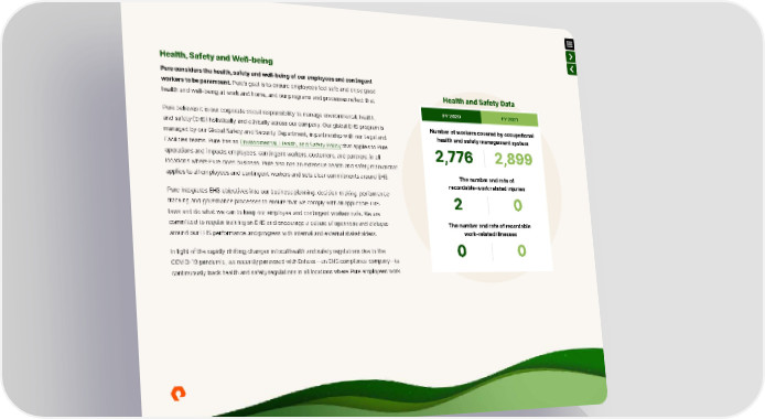 Health, Safety and Well-being Pure considers the health, safety and well-being of our employees and contingent workers to be paramount. Pure’s goal is to ensure employees feel safe and enjoy good Health and Safety Data health and well-being at work and home, and our programs and processes reflect that. FY21 Pure believes it is our corporate social responsibility to manage environmental, health, FY 2020 FY 2021 and safety (EHS) holistically and ethically across our company. Our global EHS program is Number of workers covered by occupational managed by our Global Safety and Security Department, in partnership with our Legal and health and safety management system Facilities teams. Pure has an Environmental, Health, and Safety Policy that applies to Pure operations and impacts employees, contingent workers, customers, and partners, in all 2,776 2,899 locations where Pure does business. Pure also has an extensive health and safety manual that applies to all employees and contingent workers and sets clear commitments around EHS. The number and rate of recordable-work related injuries Pure integrates EHS objectives into our business planning, decision-making, performance tracking and governance processes to ensure that we comply with all applicable EHS 2 0 laws and do what we can to keep our employee and contingent workers safe. We are committed to regular training on EHS and encourage a culture of openness and dialogue The number and rate of recordable around our EHS performance and progress with internal and external stakeholders. work-related illnesses In light of the rapidly shifting changes in local health and safety regulations due to the 0 0 COVID-19 pandemic, we recently partnered with Enhesa—an EHS compliance company—to continuously track health and safety regulations in all locations where Pure employees work.