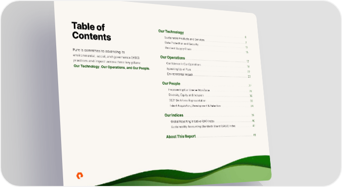 Table of Our Technology ............................................................................................................................................................6 Sustainable Products and Services ..........................................................................................................7 Contents Data Protection and Security ..........................................................................................................................13 Resilient Supply Chain ............................................................................................................................................15 Pure is committed to advancing its Our Operations .............................................................................................................................................................17 environmental, social, and governance (ESG) practices and impact across three key pillars: Confidence in Our Operations .......................................................................................................................18 Our Technology, Our Operations, and Our People. Speaking Up at Pure ................................................................................................................................................ 22 Environmental Impact ............................................................................................................................................. 23 Our People............................................................................................................................................................................. 27 Empowering Our Diverse Workforce ....................................................................................................28 Diversity, Equity and Inclusion ..................................................................................................................30 2021 Workforce Representation ..............................................................................................................33 Talent Acquisition, Development & Retention ..........................................................................34 Our Indices ........................................................................................................................................................................... 39 Global Reporting Initiative (GRI) Index ...............................................................................................40 Sustainability Accounting Standards Board (SASB) Index .........................................47 About This Report ................................................................................................................................................. 49