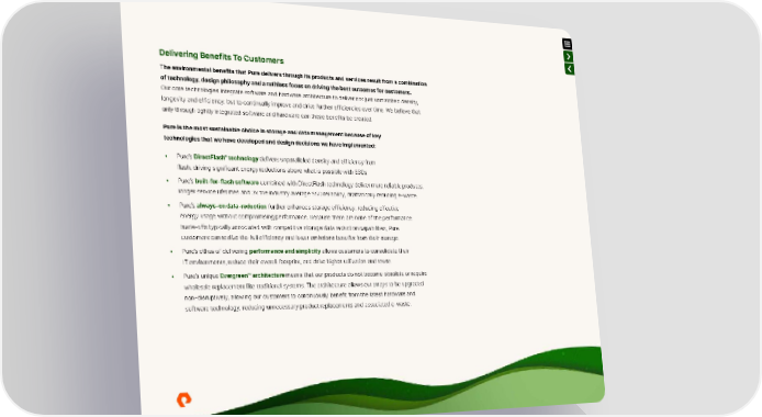 Delivering Benefits To Customers The environmental benefits that Pure delivers through its products and services result from a combination of technology, design philosophy and a ruthless focus on driving the best outcomes for customers. Our core technologies integrate software and hardware architecture to deliver not just unmatched density, longevity and efficiency, but to continually improve and drive further efficiencies over time. We believe that only through tightly integrated software and hardware can these benefits be created. Pure is the most sustainable choice in storage and data management because of key technologies that we have developed and design decisions we have implemented: ® technology delivers unparalleled density and efficiency from • Pure’s DirectFlash flash, driving significant energy reductions above what is possible with SSDs • Pure’s built-for-flash software combined with DirectFlash technology deliver more reliable products, longer service lifetimes and 3x the industry average SSD reliability, dramatically reducing e-waste. • Pure’s always-on data-reduction further enhances storage efficiency, reducing effective energy usage without compromising performance. Because there are none of the performance trade-offs typically associated with competitive storage data reduction capabilities, Pure customers can realize the full efficiency and lower emissions benefits from their storage. • Pure’s ethos of delivering performance and simplicity allows customers to consolidate their IT environments, reduce their overall footprint, and drive higher utilization and reuse. • Pure’s unique Evergreen™ architecture means that our products do not become obsolete or require wholesale replacement like traditional systems. The architecture allows our arrays to be upgraded non-disruptively, allowing our customers to continuously benefit from the latest hardware and software technology, reducing unnecessary product replacements and associated e-waste.