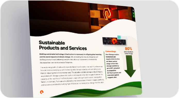 Sustainable 80% Products and Services Carbon Usage Drive Out Direct Building sustainable technology infrastructure is necessary to mitigate global warming Pure Storage enables Carbon Usage and the worst impacts of climate change. We are leading the way by designing and businesses and building products and delivering services that allow our customers to dramatically organizations to drive decrease their own environmental footprints. out direct carbon usage in their data The explosive growth of data and corporate digital transformation has kept IT professionals storage systems by focused more on keeping up with increasing data storage capacity and controlling costs up to 80% compared than on reducing their environmental load. The decades-old data storage product industry to competitive responded with storage systems still built on old magnetic disk technologies to deliver this All-Flash systems and even more against capacity at the sacrifice of inefficient power usage and significant e-waste, among other magnetic disk. factors. In contrast, Pure was unburdened by the compromises inherent in legacy platforms, and we were committed to building high efficiencies in all areas of our design from the start.