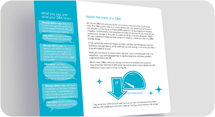 What you say, and Inside the mind of a DBA what your DBA hears: An Oracle DBA lives and dies by the performance and availability of enterprise Storage Admin says: With the data. The DBA guards data as a lioness guards her cubs. Anything that threatens current storage infrastructure, the smooth functioning of an Oracle DBA’s systems is to be treated with extreme I can’t support RAID 10. We just prejudice. Unfortunately, that sometimes includes the storage infrastructure and the don’t have enough capacity. people who manage it. Only the very best will do for an Oracle database – RAID DBA hears: You are an enemy 10, sub millisecond response time, oceans of capacity – these are a few of a DBA’s of efficient data management. favorite things. If high availability and performance are bacon and Bon Jovi (things you love) then Storage Admin says: To downtime and high latency are Brussels sprouts and waiting in line at the post office – support your IOPS and latency to be eliminated at all cost. requirements, we are going to While you would love to shower them with flash cache, short-stroked LUNs, and need performance HDD’s and snapshots – you can’t because that is way too expensive. And they just don’t cache. We don’t have the budget understand that trade-off. this quarter. What’s more, DBAs view your storage maintenance windows with suspicion. DBA hears: I am over- They remember that time in 2011 when the maintenance window spilled over into complicating your simple production hours due to a faulty .config file. request for a moderate amount of performance storage, u i m d e m despite the fact that you fund much of my storage budget. h i Storage Admin says: We have IT w gh a storage maintenance window ol next week. Unfortunately we may have to bring down the DB Performance database for a couple of hours. DBA hears: ALERT! CODE RED! Shoot first, ask questions later. They remember 2011 because nothing is worse than the database being down – and the CIO suddenly knows their name as “that guy responsible for the outage.”