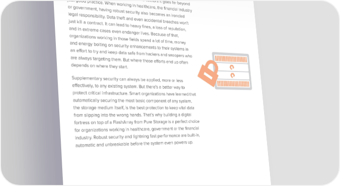 MODERN DIGITAL FORTRESSES REQUIRE SOLID FOUNDATIONS Protecting vital information from accidents and theft is the key to success for any organization. But in some sectors it goes far beyond just good practice. When working in healthcare, the financial industry or government, having robust security also becomes an ironclad legal responsibility. Data theft and even accidental breaches won’t just kill a contract. It can lead to heavy fines, a loss of reputation, and in extreme cases even endanger lives. Because of that, organizations working in those fields spend a lot of time, money and energy bolting on security enhancements to their systems in an effort to try and keep data safe from hackers and snoopers who are always targeting them. But where those efforts end up often depends on where they start. Supplementary security can always be applied, more or less effectively, to any existing system. But there’s a better way to protect critical infrastructure. Smart organizations have learned that automatically securing the most basic component of any system, the storage medium itself, is the best protection to keep vital data from slipping into the wrong hands. That’s why building a digital fortress on top of a FlashArray from Pure Storage is a perfect choice for organizations working in healthcare, government or the financial industry. Robust security and lightning fast performance are built-in, automatic and unbreakable before the system even powers up. © Pure Storage 2014 | 2