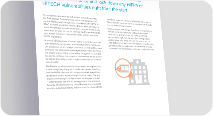 PROTECTING PERSONAL INFORMATION IN HEALTHCARE cont. Implementing a Pure Storage FlashArray can both improve performance and lock down any HIPPA or HITECH vulnerabilities right from the start. To protect data internally as well as from external snooping, saved and protected just like anything else stored with the the Pure Storage FlashArray uses robust role-based access FlashArray, this can either be done immediately or at a later control (RBAC), which brings it into compliance with HIPPA. All time as part of an investigation. RBAC accounts are tied to system administrators, so that only Implementing a Pure Storage FlashArray for organizations users with storage administration rights can give access to any application or host. No regular user can modify permissions to working within the healthcare field can both improve gain access to content they should not be able to see under performance and lock down any HIPPA or HITECH HIPPA regulations. vulnerabilities right from the start. This won’t preclude additional security being added to the system, but full But even administrators, with their ability to control access, are AES-256-bit encryption, role-based access control and the not completely unregulated. Administrators of the FlashArray generation of a complete audit trail means that personal can also be set up according to their roles, so that just because information will be kept secure from any unauthorized eyes. someone has administrator privileges doesn’t mean they have full access to everything protected by the system. They might be able to configure the system or troubleshoot issues, but can be denied the ability to read or capture protected information stored inside. The FlashArray also automatically produces a complete audit trail of everything that goes on within the system, satisfying another HIPPA mandate. All configurations are logged into the system as well as any changes that are made. That way anyone attempting to change access permissions, even an IT administrator, has that action logged and time stamped. Security officials monitoring the system can then choose to examine suspicious activity. And because the information is © Pure Storage 2014 | 4