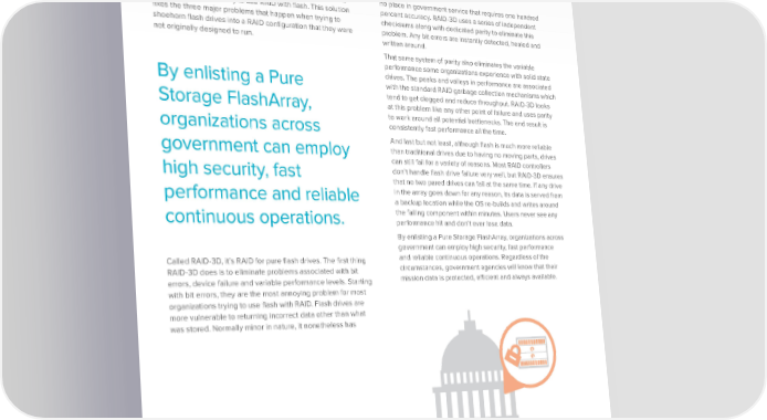 BUILDING SECURE AND REDUNDANT STORAGE FOR FEDERAL, STATE AND LOCAL GOVERNMENTS cont. point of failure. The array is able to do this because the OS is no place in government service that requires one hundred built specifically as a way to use RAID with flash. This solution percent accuracy. RAID-3D uses a series of independent fixes the three major problems that happen when trying to checksums along with dedicated parity to eliminate this shoehorn flash drives into a RAID configuration that they were problem. Any bit errors are instantly detected, healed and not originally designed to run. written around. That same system of parity also eliminates the variable performance some organizations experience with solid state drives. The peaks and valleys in performance are associated By enlisting a Pure with the standard RAID garbage collection mechanisms which tend to get clogged and reduce throughput. RAID-3D looks Storage FlashArray, at this problem like any other point of failure and uses parity to work around all potential bottlenecks. The end result is organizations across consistently fast performance all the time. And last but not least, although flash is much more reliable government can employ than traditional drives due to having no moving parts, drives can still fail for a variety of reasons. Most RAID controllers high security, fast don’t handle flash drive failure very well, but RAID-3D ensures that no two pared drives can fail at the same time. If any drive performance and reliable in the array goes down for any reason, its data is served from a backup location while the OS re-builds and writes around continuous operations. the failing component within minutes. Users never see any performance hit and don’t ever lose data. By enlisting a Pure Storage FlashArray, organizations across government can employ high security, fast performance Called RAID-3D, it’s RAID for pure flash drives. The first thing and reliable continuous operations. Regardless of the RAID-3D does is to eliminate problems associated with bit circumstances, government agencies will know that their errors, device failure and variable performance levels. Starting mission data is protected, efficient and always available. with bit errors, they are the most annoying problem for most organizations trying to use flash with RAID. Flash drives are more vulnerable to returning incorrect data other than what was stored. Normally minor in nature, it nonetheless has © Pure Storage 2014 | 8